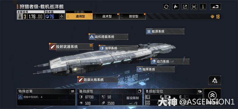 白板状态:血量67730,物理护甲50,能量护盾10%,速度500/2500,主武器为物理伤害导弹发射器*2,单发伤害65,单轮发射8枚,持续6s冷却15s。副武器为舰载机搭载系统。可搭载中型/轻型机编队*4。还有四门刮痧火炮忽略。